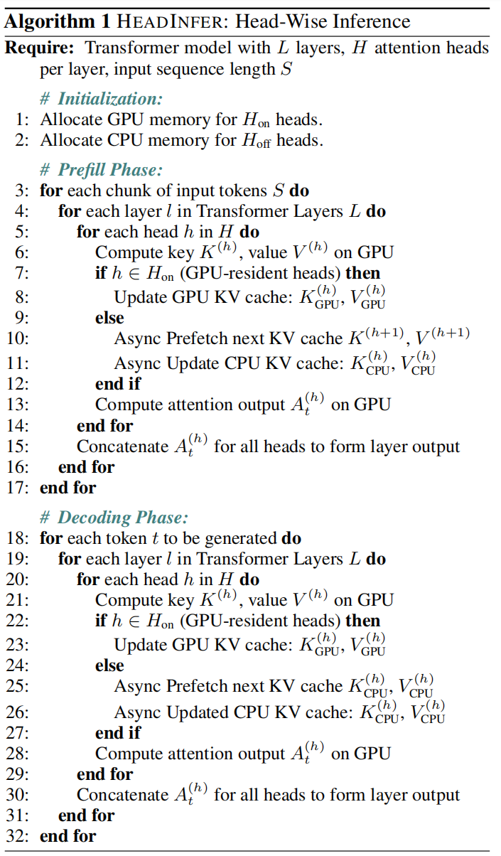 - 每生成一个 token 都要对所有先前 token 的 KV 做 attention(对应的 head-level KV 也随之增长)。HEADINFER 在 decoding 阶段仍然采用相同的 head-wise 迁移策略,保证每个 head 的 attention output 在 GPU 上计算,KV 的移动通过异步预取 / 异步写回完成,算法在 Algorithm 1 的第 18–32 行给出完整流程。