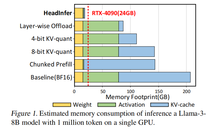 Transformer-based LLM 在长上下文场景下的推理性能显著,但随着上下文长度的扩展,KV cache(key-value cache)迅速成为内存占用的主要瓶颈。论文指出:例如对 Llama-3-8B 进行 1M token 推理时,KV cache 可达 128 GB,整体内存可达 207 GB(权重 + activation + KV cache),这是在常见 BF16 设置下的估算,使得在消费级 GPU(如 RTX-4090,24GB)上无法直接执行长上下文推理。为解决此类问题,作者提出 HEADINFER —— 通过按 attention head 维度进行细粒度 KV cache 离线/回传(offload),仅在 GPU 上保留部分 attention heads 的 KV,从而极大地压缩 GPU 端 KV 的占用,同时保证数学等价性(lossless)和兼容各种 attention 形式(dense / sparse)。论文摘要与引言的核心论点与数据来自原文说明。