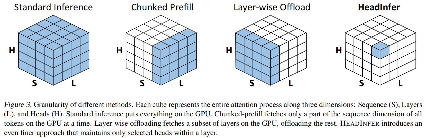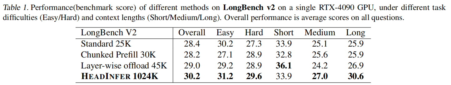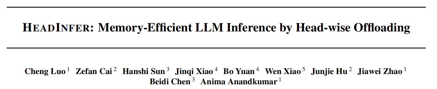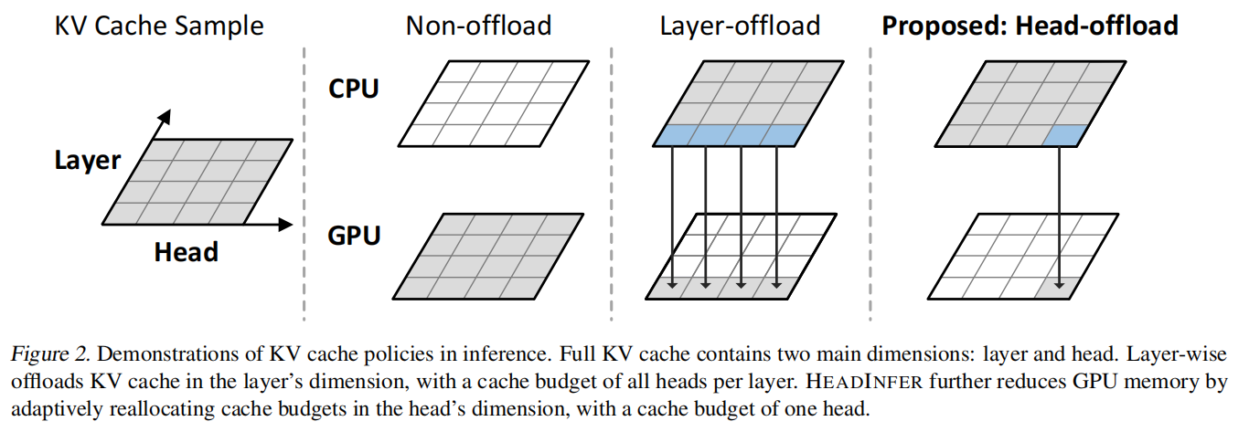 - 提出 HEADINFER:基于 head-wise offloading 的 KV 管理策略,使 GPU 端只保留极少的 head KV(甚至每次只保留 1 个 head),实现数学等价的长上下文推理。