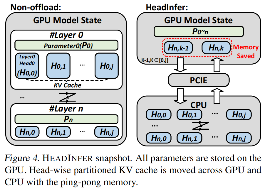 KV Offloading 的既有工作:LayerKV、FastDecode、NEO、ShadowKV、FlexInfer、Infinigen 等都是将 KV 缓存移动到外部(CPU/磁盘/压缩表征)来换取更长的上下文,HEADINFER 在粒度和 overlapped transfer 上做了不同的工程设计以实现对消费级 GPU 的支持。