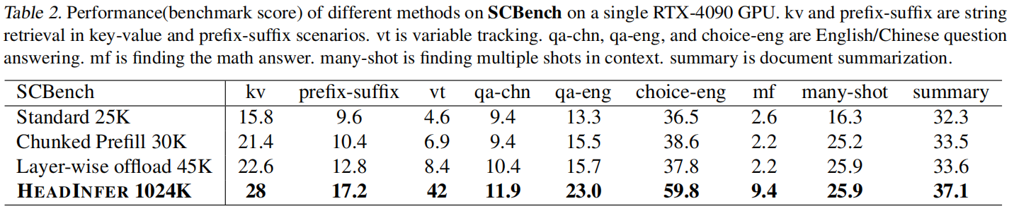 SCBench(表 2):HEADINFER 在一组 KV-centric 任务上全项优于其他方法(例如 kv、prefix-suffix、variable tracking 等),尤其在 many-shot / retrieval 类任务增益明显,说明更长上下文显著提升实际能力(而且 HEADINFER 保证无损)。