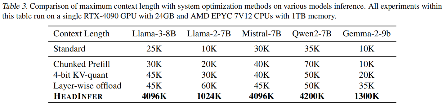 - 比较结果(在单卡 RTX-4090 上)显示:Standard ~ 25K,Chunked ~ 30K,4-bit KV-quant ~ 45K,Layer-wise offload ~ 45K,而 HEADINFER 可以达到 4096K(4,096K)(对于 Llama-3-8B),其他模型也有大幅扩展(例如 Qwen2-7B 到 4200K)。这说明 HEADINFER 的 head-wise 策略能把限制从 GPU HBM 转移到 CPU RAM(可配置更大),从而显著提升最大可支持的上下文长度。