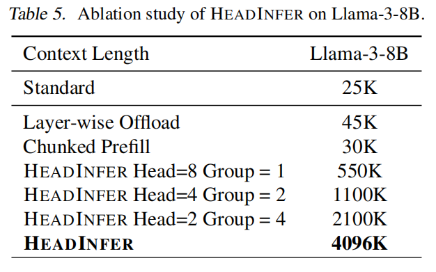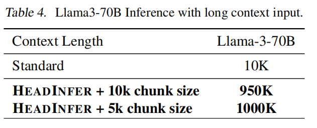 - CPU RAM 容量是限制 HEADINFER 能否继续扩展上下文的另一个瓶颈(论文在多处说明 Llama-3 / Mistral 等模型的 1M+/4M 支持最终受 CPU RAM 限制)。若需要更大上下文,可把 offload 目标改为 NVMe,但需要考虑更高的延迟。