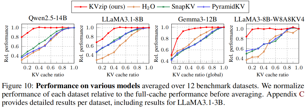 在 LLaMA3.1 / Qwen2.5 / Gemma3 多种模型 + 12 类任务上验证 在 50–70% eviction 下几乎无损。
