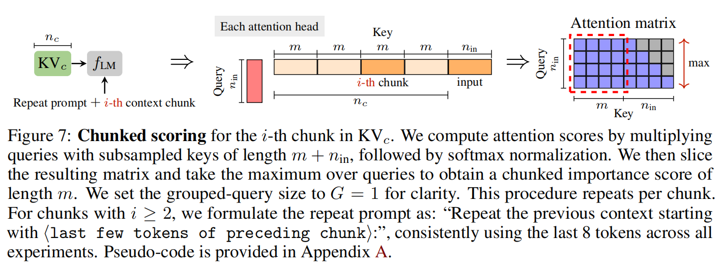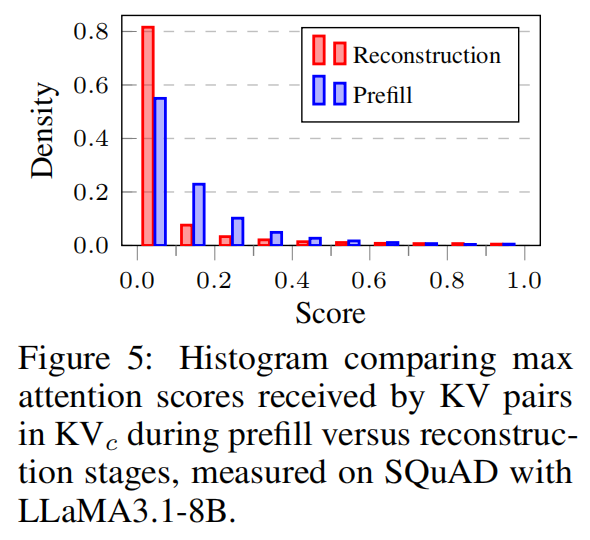 - [cite_start]具体的逻辑是:输入中拼接的 Context 部分实际上充当了“正在生成的 token”的角色,它们回头去关注 $KV_c$(缓存的上下文),由此产生的**最大交叉注意力分数(Max Cross-Attention Score)**即代表了该 KV 对的重要性 [cite: 144, 153]。