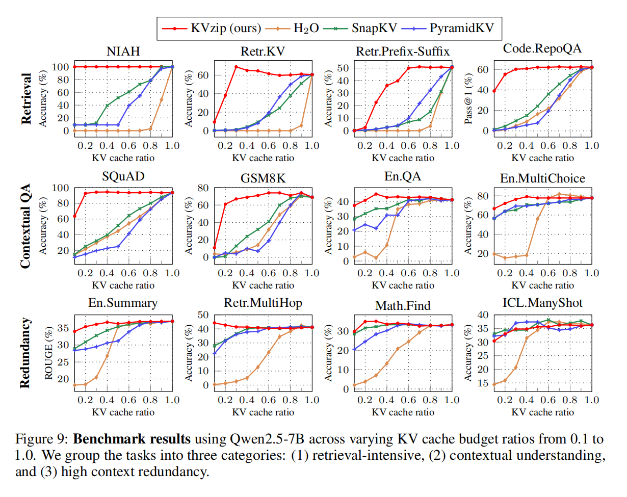 (1)同样 eviction 下,KVzip 在所有任务上均接近无损