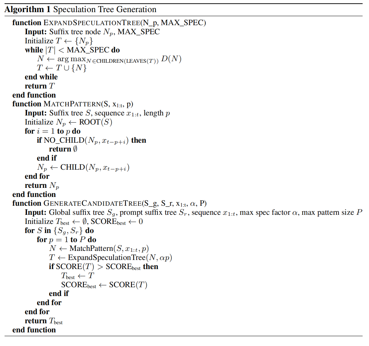 由于SuffixDecoding维护两个后缀树(全局和每请求)并考虑多种模式长度$p$,它会生成多个候选推测树。为选择最佳候选,定义评分函数: $$SCORE(T_{spec}) = \sum_{N \in T_{spec}} D(N)$$