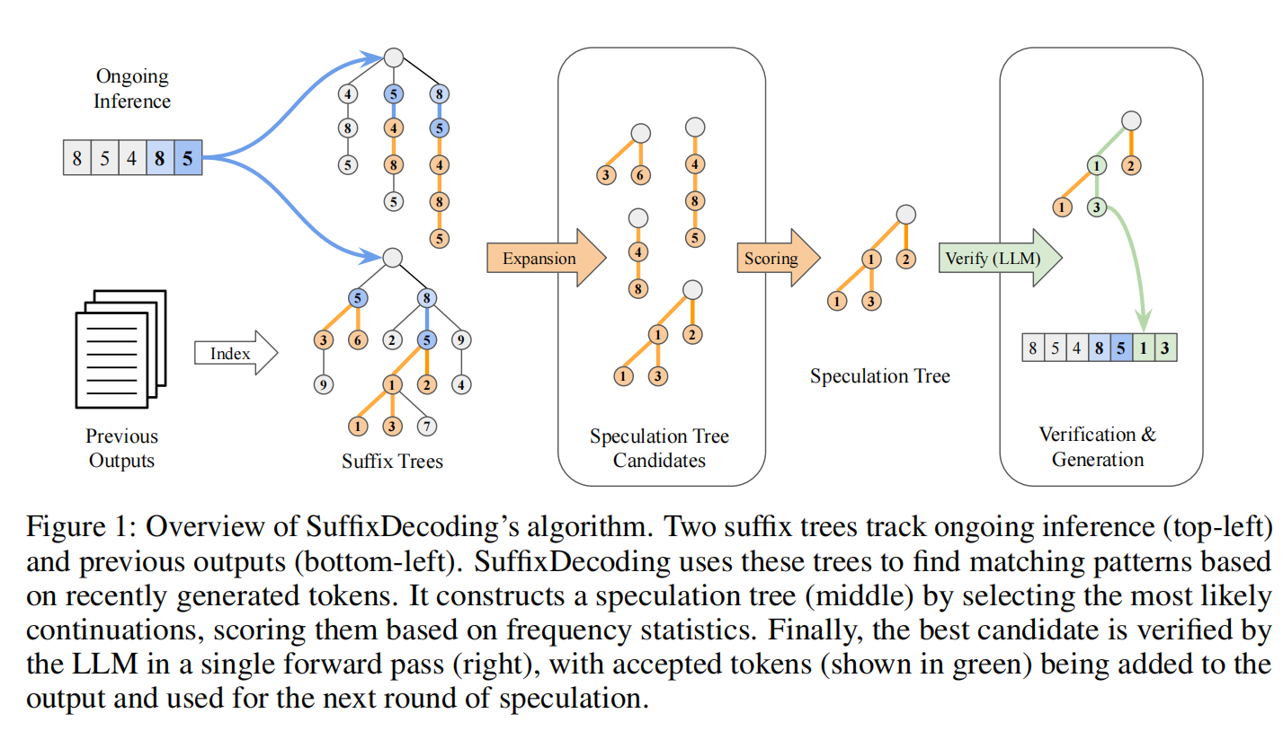 这篇 paper 针对 AI 应用中大量推理请求呈现 高度重复、模式化且可预测 的特性,提出了一个我觉得非常优秀的推测解码方法。起初我以为它的思路类似于 prefix cache,但实际阅读后发现:SuffixDecoding 基于 suffix tree 的方法对于 speculative decoding 的约束要小得多。 Prefix cache 需要所有 token 完全一致才能命中,而 SuffixDecoding 只需满足 speculative decoding 的验证条件即可,大大提升了复用空间和适用范围。