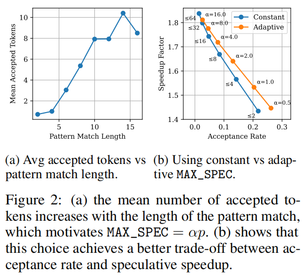 关键观察:实验发现接受的token数量随模式匹配长度$p$显著增加(图2a)。基于此,SuffixDecoding定义: $$MAX_SPEC(p) = \alpha p$$ 其中$\alpha$是用户定义的最大推测因子(通常在1-4之间)。