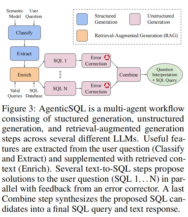 - SQL Generation (SQL 1…N): Several text-to-SQL agents produce candidates, assisted by error correction