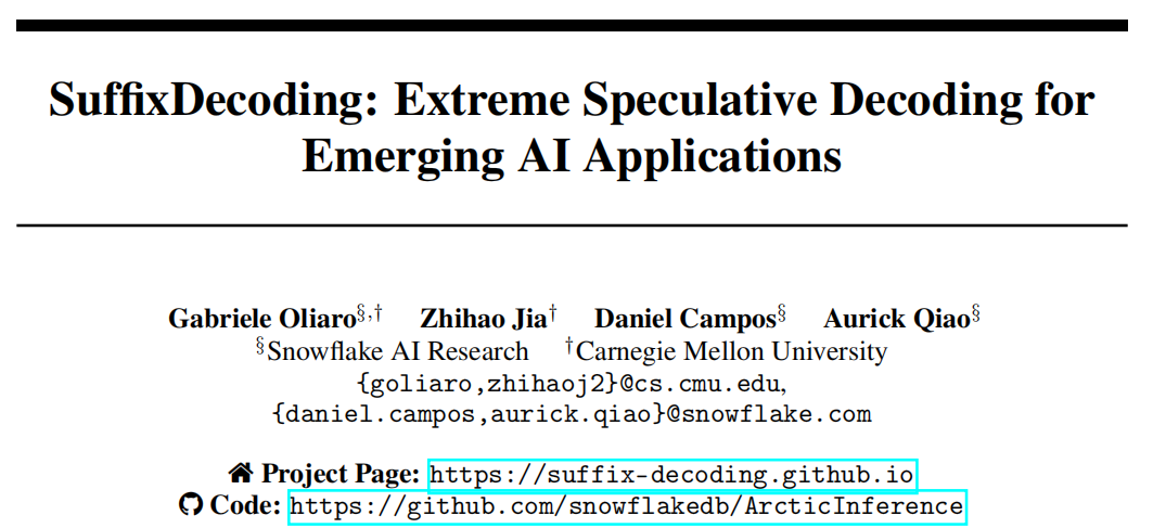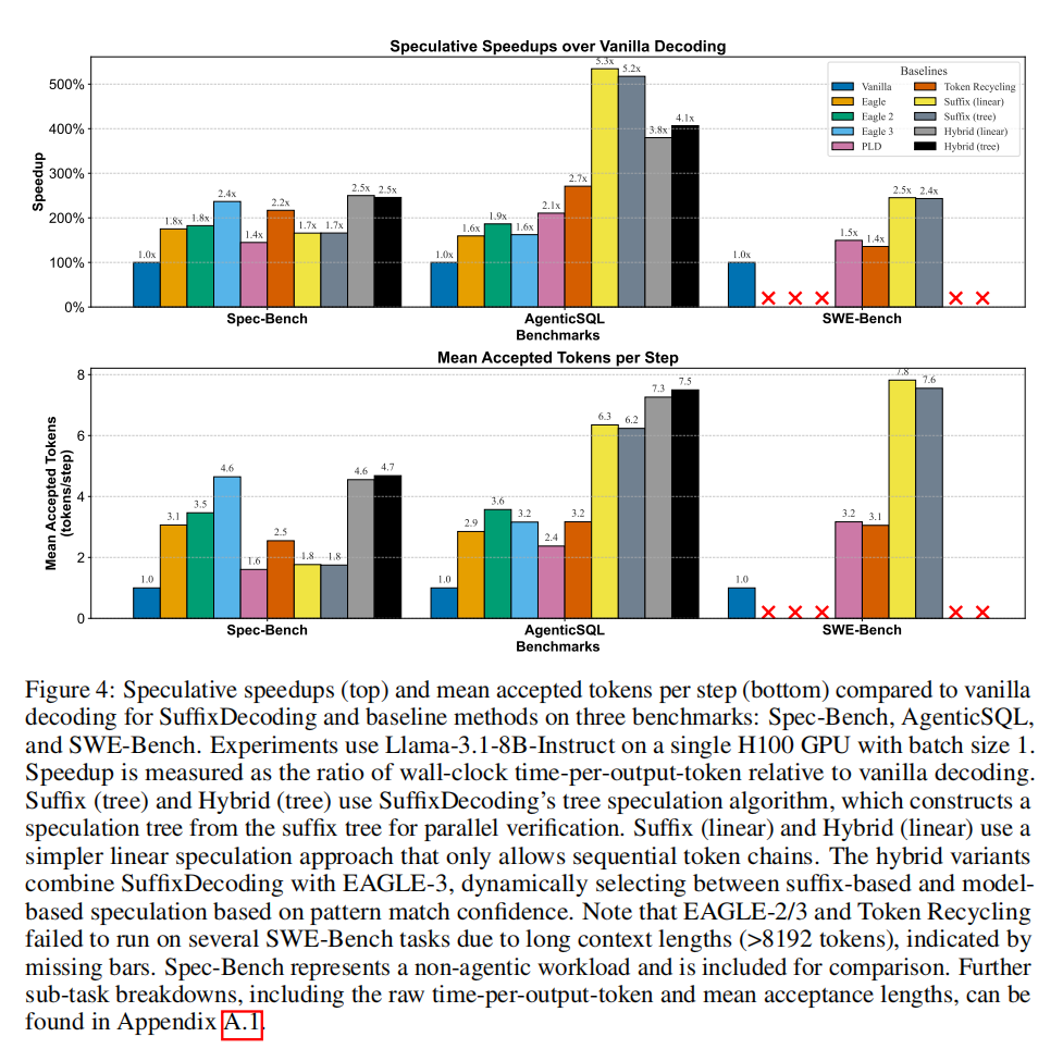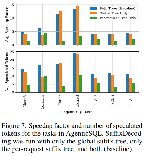 - AgenticSQL:SuffixDecoding获得5.3×平均加速,比EAGLE-2/3快2.8×,比Token Recycling快1.9×