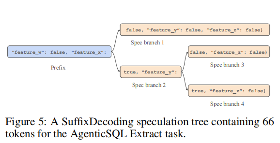 推测树分析:图5展示了AgenticSQL Extract任务的推测树实例。该任务输出JSON文档,具有固定结构和布尔值特征。SuffixDecoding成功捕获了这些模式,构建了一个包含66个token的推测树,其中每个布尔值分支都对应一种可能的输出路径。在实际验证中,正确路径往往能一次性接受数十个token,显著加速生成过程。