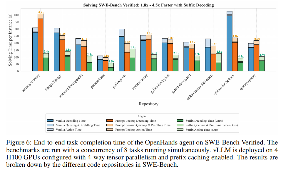 在真实vLLM部署中,SuffixDecoding显著加速了OpenHands智能体在SWE-Bench上的端到端性能: