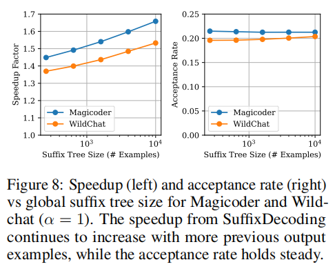 我原本担心 suffix tree 在实际部署中会因 规模过大 或 查询速度过慢 而成为瓶颈,但论文中的实验数据基本消除了这些顾虑。根据文中的测量,suffix tree 的内存效率非常高:即使缓存 572M tokens(约 20K 请求),也只占用 6.15GB CPU 内存,平均下来每个 token 仅需 10.75 bytes。在一台常见的 144GB CPU 内存的 A100 系统上,SuffixDecoding 甚至能够缓存 31 天连续生成的数据 而无需 eviction。
