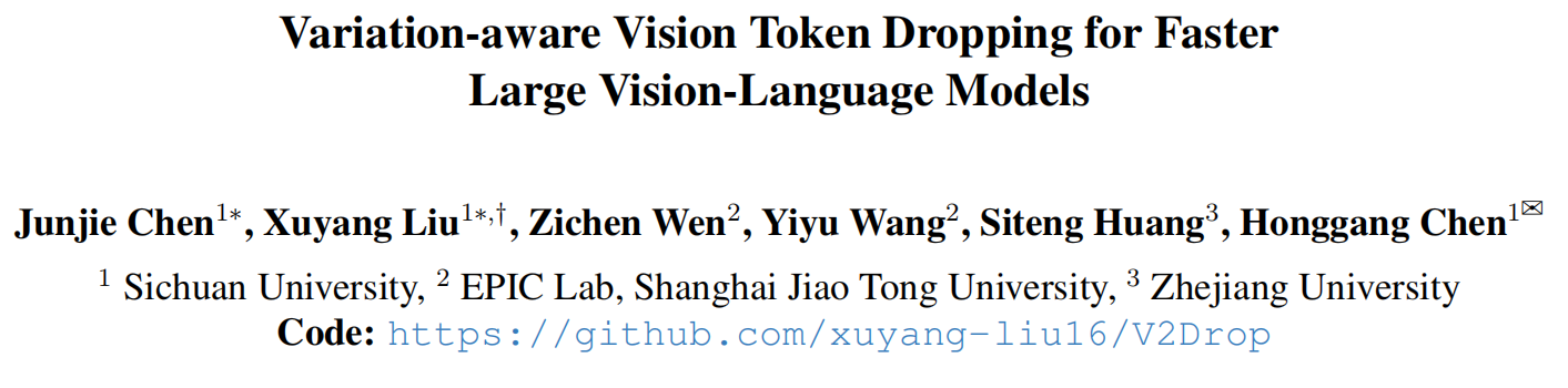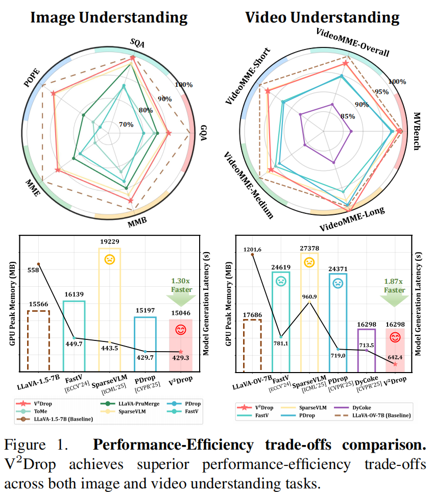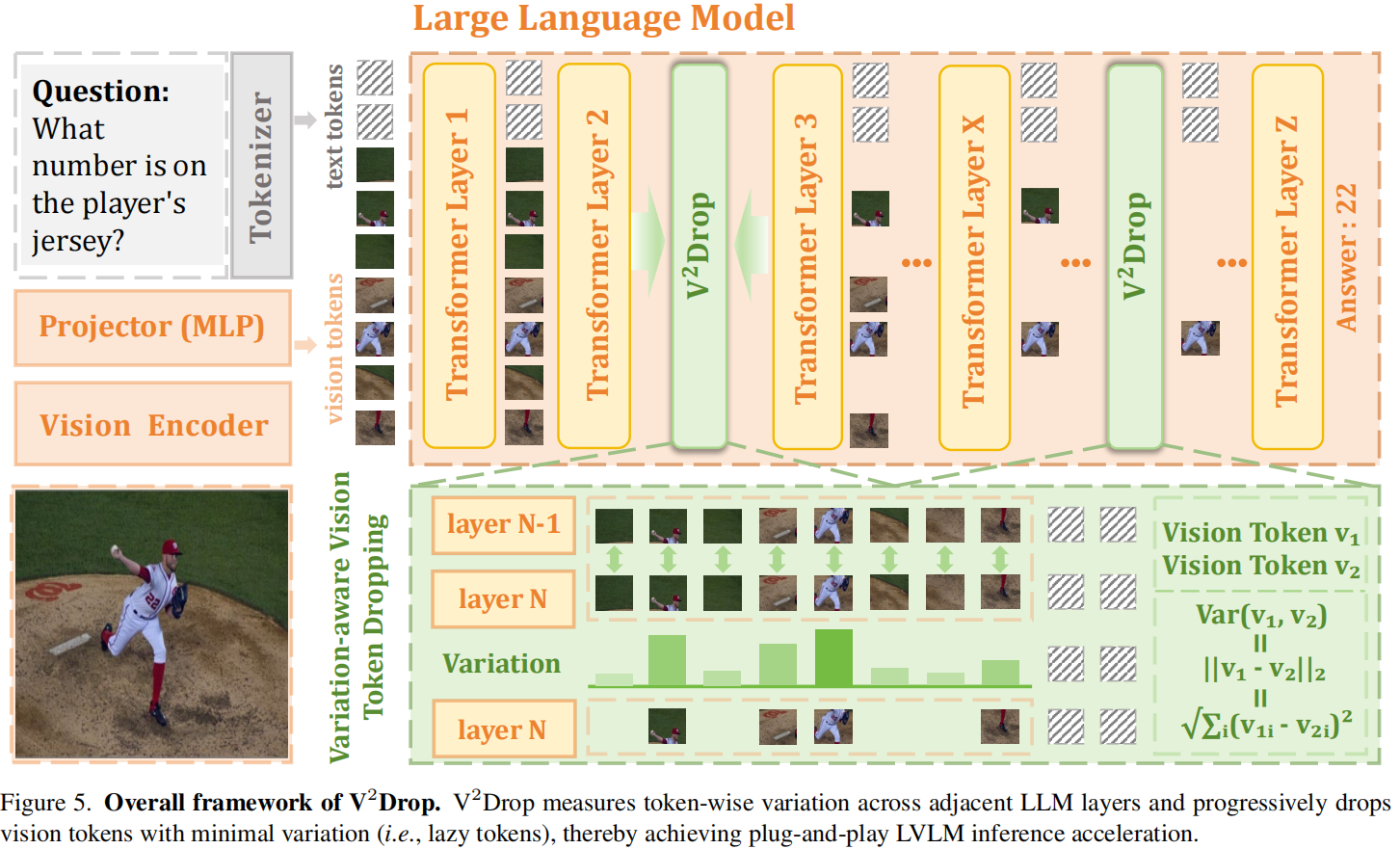 Large vision-language models(LVLMs)在多模态理解任务上表现强大,但随着高分辨率图像与长视频理解需求不断增加,视觉 token 数量急剧上升,从而显著降低推理效率。Token compression 提供了一条直接路径:在不改变模型结构的前提下减少待处理 token 数,从而提升计算效率。作者通过系统分析指出,现有 inner-LLM token compression 方法主要存在两个关键问题:positional bias 和 incompatibility with efficient operators,这两点严重阻碍了它们在 LVLM 加速中的实际部署。本文提出了首个从动态 token variation 视角出发的方法,发现 LLM 内部的视觉 token variation 具有 task-agnostic 特性。基于这一观察,作者提出 Variation-aware Vision Token Dropping(V2Drop),在 LVLM 推理过程中逐步移除 variation 最小的视觉 token,从而提升计算效率。大量实验表明,V2Drop 在图像理解任务和视频理解任务上分别保留了原始性能的 94.0% 和 98.6%,同时将 LLM generation latency 分别降低了 31.5% 和 74.2%。