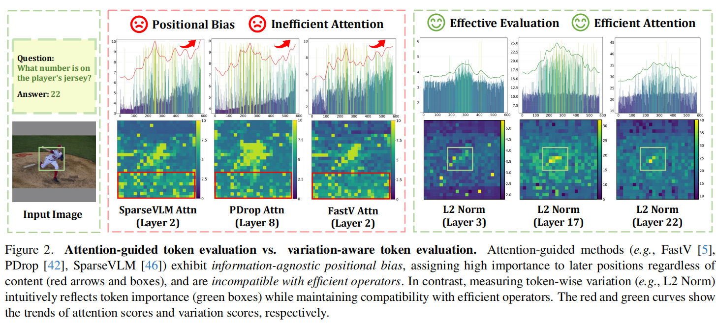 然而,大多数 Inner-LLM 方法依赖 attention weights,因而存在两个问题:一是无法与 FlashAttention 等 efficient attention operator 兼容,导致显存峰值上升;二是容易产生 positional bias,偏向保留序列末端 token,而忽略真正关键的视觉区域。作者因此转向低 variation token 的渐进式丢弃,以实现无需 attention weights 的训练自由加速。