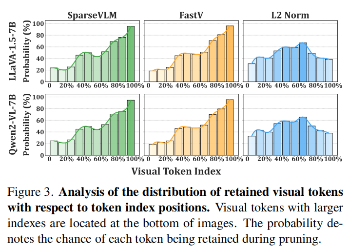 作者进一步分析了 attention-guided 方法为何会产生 content-agnostic positional bias。Figure 2 和 Figure 3 的结果说明:即使某些重要区域确实获得较高 attention score,这些方法仍然会过度偏向序列末端 token,导致前面真正有用的信息被误删,最终造成 multimodal hallucination。作者在 TextVQA、POPE 和 MME 上按 token index 分段统计保留概率,发现 FastV、SparseVLM 等方法呈现明显的 end-of-sequence bias。