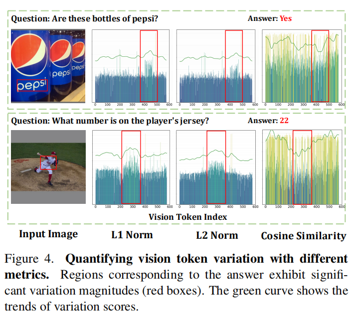 Figure 4 给出定性证据:在 LLaVA-1.5-7B 第三层 transformer 中,具有显著 variation 的 token(高 L1/L2、低 cosine similarity)与答案相关区域高度一致,例如 “Are these bottles of pepsi?” 中与 pepsi 瓶子相关的 token,以及 “What number is on the player’s jersey?” 中与球衣数字相关的 token(如答案 22 对应区域)。相反,variation 较小的 token 多落在任务无关区域。