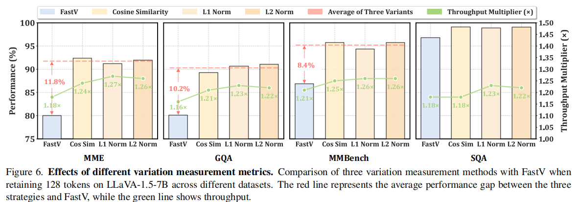 Table 7 和 Table 9 进一步给出了三种 variation metric 在多个数据集上的 throughput 与 performance。结果表明,variation-based pruning 相比 FastV 这类 attention-score-based pruning,不但性能更好,而且吞吐也更高,进一步说明 V2Drop 的稳健性。作者还指出,L2 Norm 是默认选择,因为它兼顾了效果和实现简洁性。