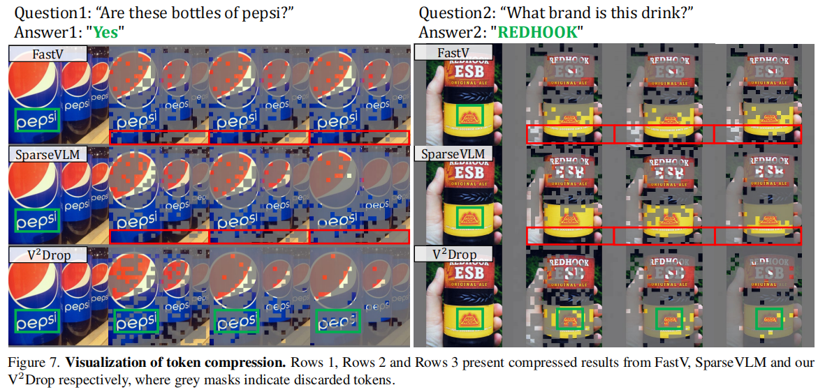 Figure 7 展示了 TextVQA 上的 token compression 可视化结果。作者从左到右展示不同层剪枝后的图像压缩效果:FastV 使用 one-time dropping,会在后续层保留一些冗余 token;SparseVLM 虽然采用 progressive dropping,但仍然存在 positional bias,倾向于保留后序 token,因而会丢失一些前部重要信息;而 V2Drop 则依据 variation 逐步保留关键区域,能更稳定地锁定语义核心。