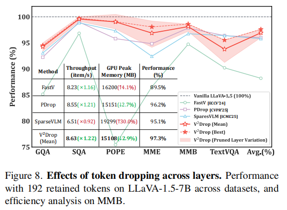 Table 6 的结果说明,不同 pruning layer 组合都会带来相近的效果,尤其在 192 retained tokens 下,V2Drop 的平均表现维持在 96%~97.6% 之间,证明它对 layer scheduling 不敏感。换句话说,V2Drop 的效果不是建立在某个“神奇层号”上,而是来自 variation 作为 token importance 信号的有效性。