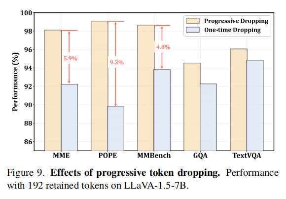 Figure 9 对比了 progressive dropping 与 one-time dropping。结果显示 progressive dropping 明显更优,尤其在 MME 和 POPE 上分别提升 5.9% 和 9.3%。其原因在于:逐步丢弃能让模型在多个层次上重新筛选 token,避免一次性删除过多关键信息,从而更稳妥地保留视觉语义。
