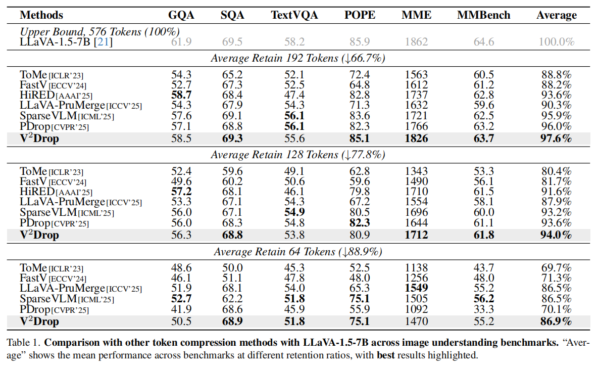 Table 1 比较了 V2Drop 与多种 token compression 方法在 LLaVA-1.5-7B 上的图像理解性能,分别在保留 192、128、64 个 token 的情况下进行对比。作者重点强调了三个结论: