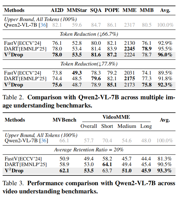 更直白地说:V2Drop 就是在几个关键层里“看谁变化大就留下谁,变化小就删掉谁”,然后继续把这些保留下来的 token 送到后续层处理。