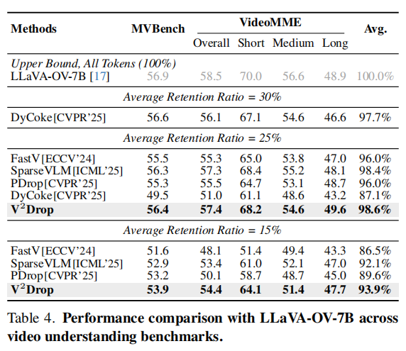 从方法设计上看,V2Drop 的关键优势是两点:第一,它不再使用 attention weights,所以天然避免 attention-guided 的 positional bias;第二,它与 FlashAttention 等 efficient operators 完全兼容,因为不需要为 token selection 额外保留昂贵的 attention map。